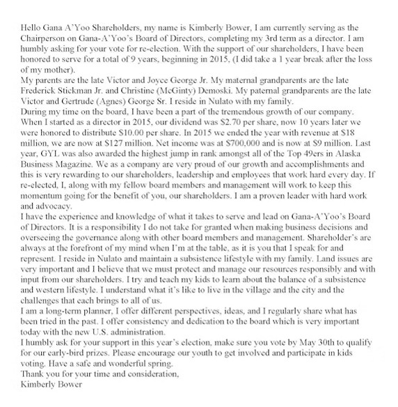 Thank you to the candidates who ran for the board this year and to Howard Darling for his service on the Gana-A’Yoo Board of Directors.